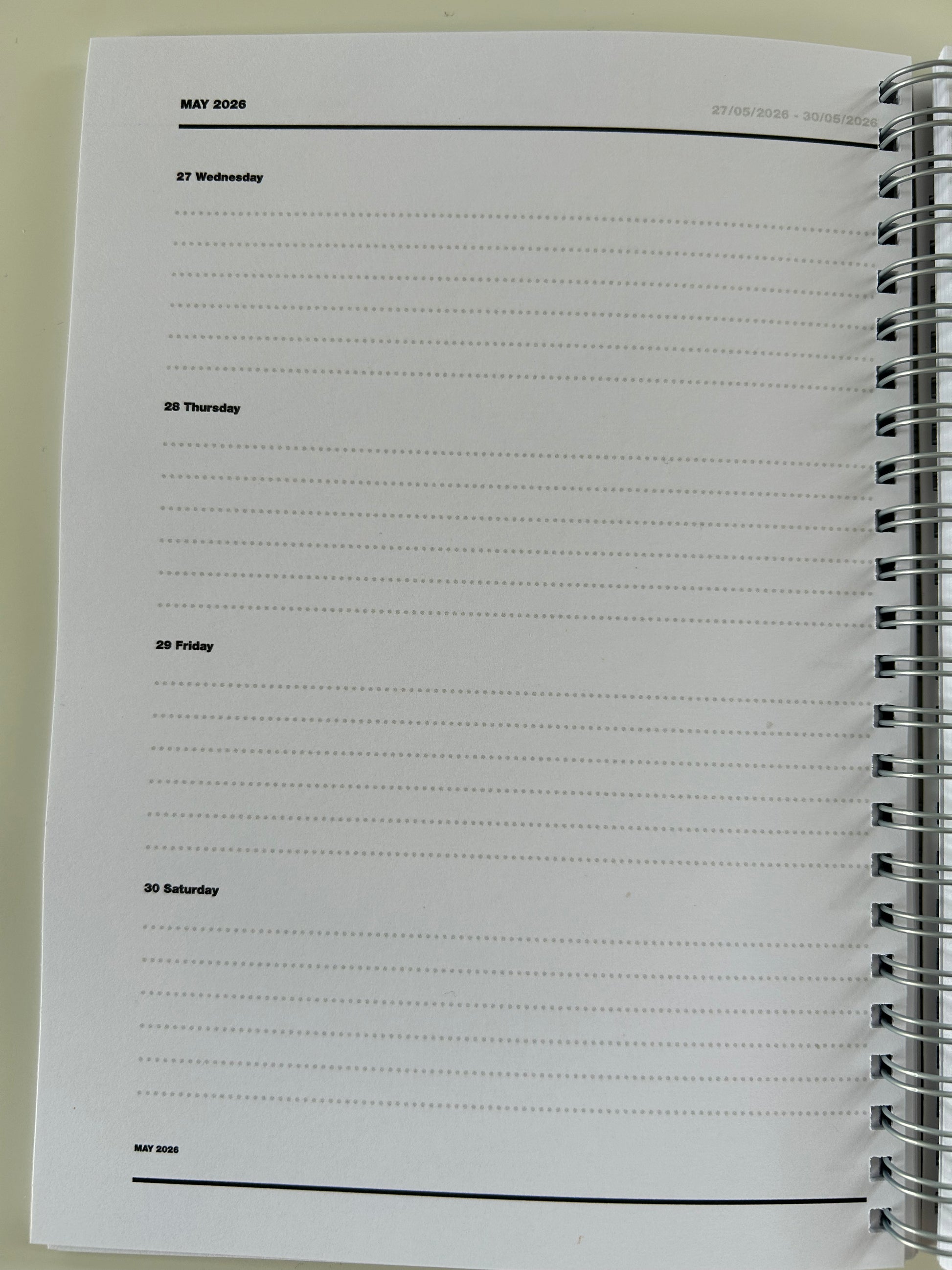 A number of our week to view diaries were unfortunately printed and bound incorrectly. Instead of throw them in the bin, we're offering them free of charge. All dates run in order however the week is not starting on a Monday (see images).